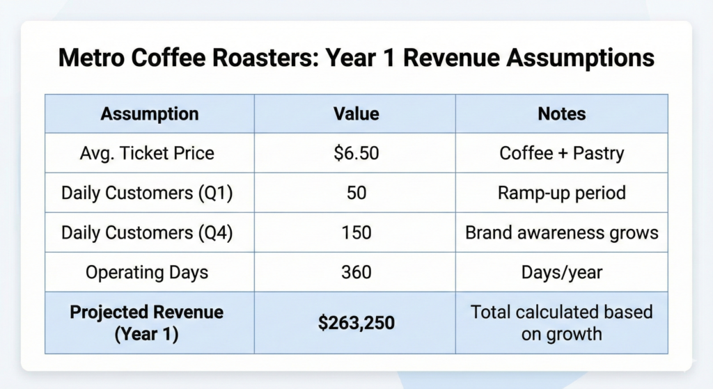 - Daily Customers (Year 1): Starts at 50/day, grows to 150/day by end of year as brand awareness grows.