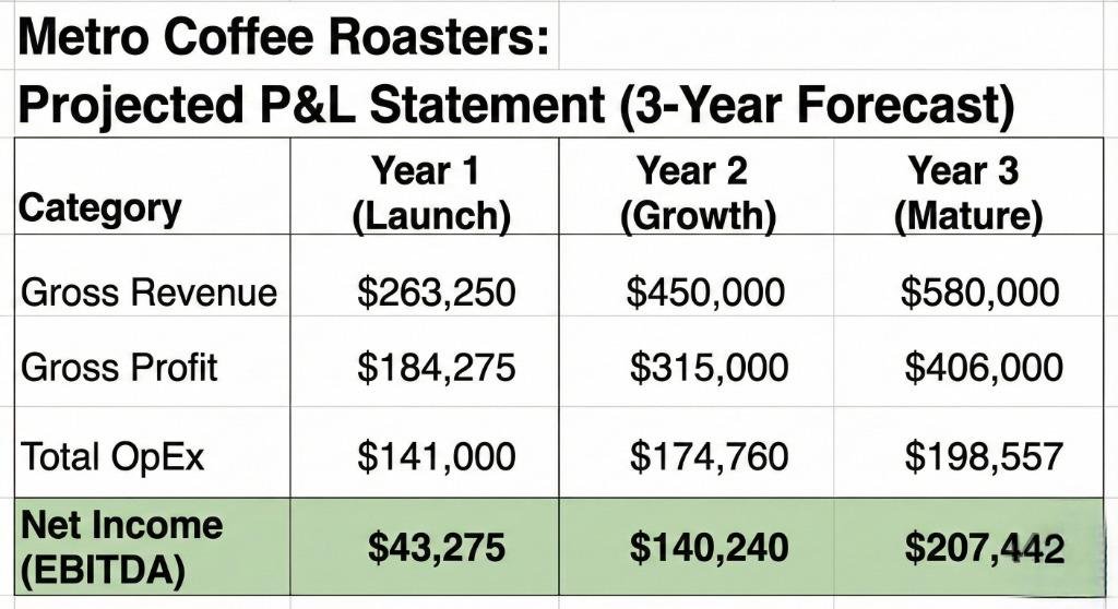 To make this useful, let’s look at a concrete example of financial forecast in business plan writing using a fictional but realistic U.S. small business.